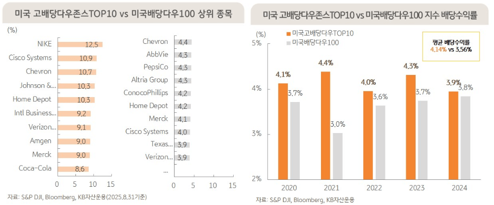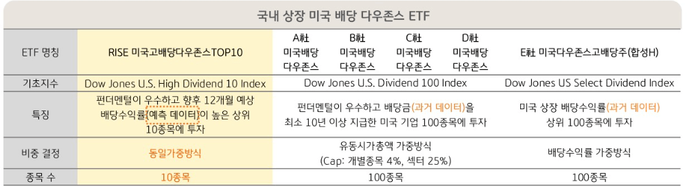 - 반면 RISE 미국고배당다우존스TOP10은 집중 전략 + 미래 배당 기준이라는 점에서 차별화