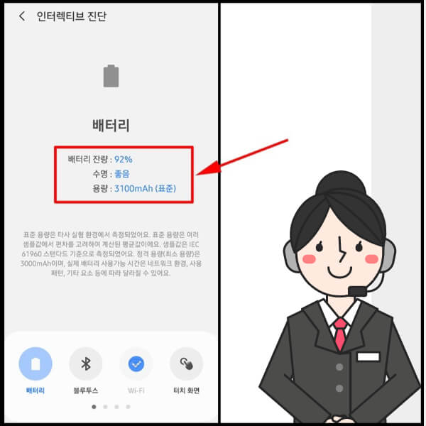 배터리 인터렉티브 진단에 배터리 잔량은 현재 충전량을 표시하고, 수명이 좋음으로 나온다면 당장 교체할 필요는 없습니다. 배터리 상태에 따라 '좋음', '보통', '나쁨'으로 표시되는데, 보통으로 나온다면 배터리 교체를 고민해봐야 하고, 나쁨으로 나온다면 스마트폰을 교체하던지, 배터리를 교체하던지 결정해야 합니다.