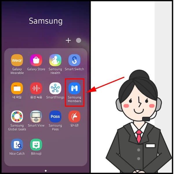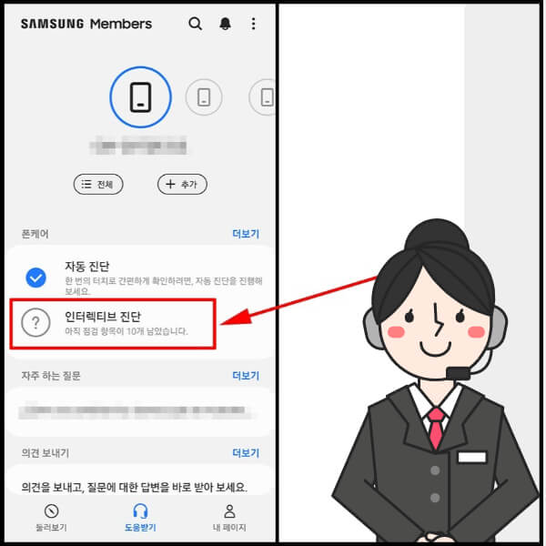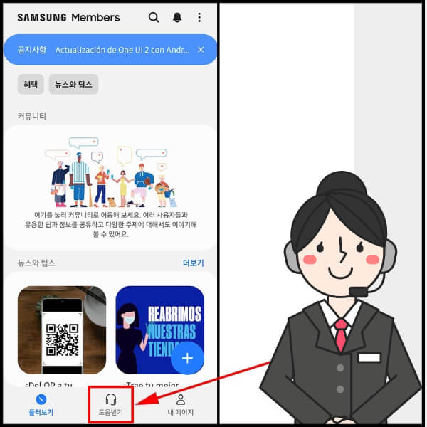 삼성 멤버스 앱을 실행하면 화면 아래 중간에 있는 '도움받기' 항목이 있는데 이를 선택합니다.