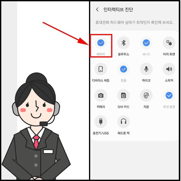 인터렉티브 진단은 스마트폰 하드웨어 상태를 점검할 수 있는 툴로, 배터리뿐만 아니라 다양한 항목을 진단할 수 있습니다.